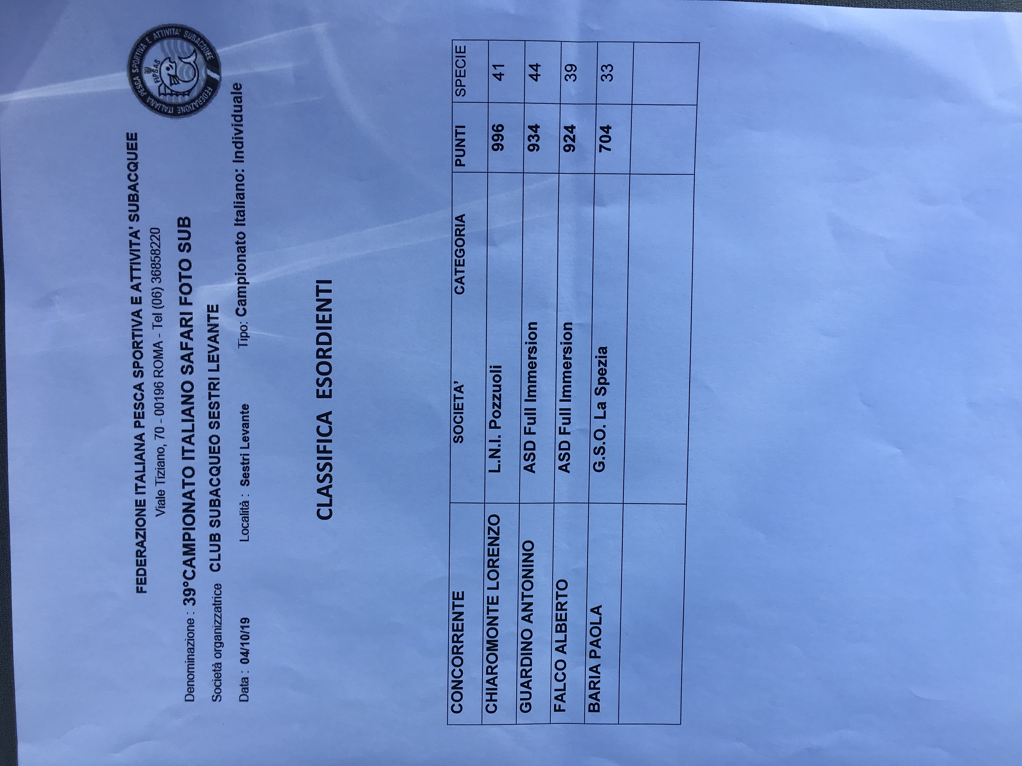 image Classifica Campionato Italiano Safari Fotosub Esordienti 2019